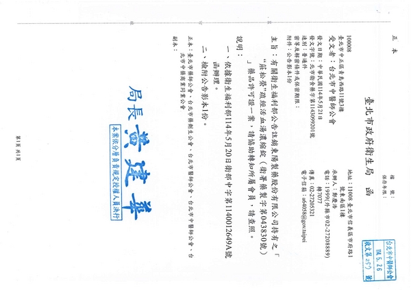 | 台北市中医师公会 官网:http://www.tpcma.org.tw 地址:台北市中正区青岛西路11号3楼 E-mail:tp.cma@msa.hinet.net 电话:(02)2314-3456(代表号) 传真:(02)2314-8181 |