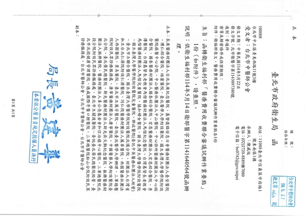 | 台北市中医师公会 官网:http://www.tpcma.org.tw 地址:台北市中正区青岛西路11号3楼 E-mail:tp.cma@msa.hinet.net 电话:(02)2314-3456(代表号) 传真:(02)2314-8181 |