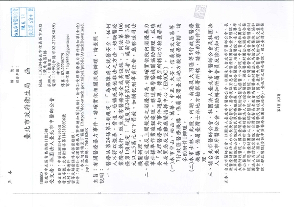 | 台北市中医师公会 官网:http://www.tpcma.org.tw 地址:台北市中正区青岛西路11号3楼 E-mail:tp.cma@msa.hinet.net 电话:(02)2314-3456(代表号) 传真:(02)2314-8181 |