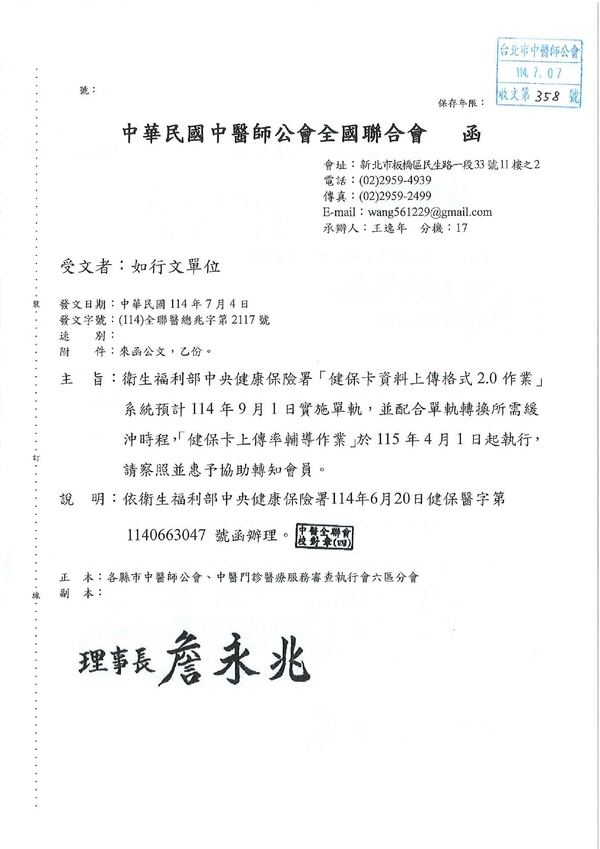 | 台北市中医师公会 官网:http://www.tpcma.org.tw 地址:台北市中正区青岛西路11号3楼 E-mail:tp.cma@msa.hinet.net 电话:(02)2314-3456(代表号) 传真:(02)2314-8181 |