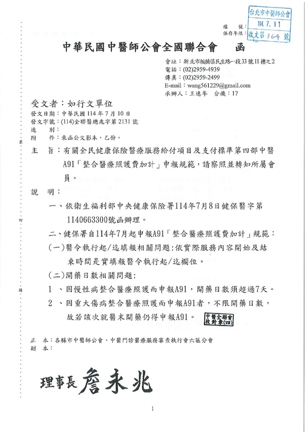 | 台北市中医师公会 官网:http://www.tpcma.org.tw 地址:台北市中正区青岛西路11号3楼 E-mail:tp.cma@msa.hinet.net 电话:(02)2314-3456(代表号) 传真:(02)2314-8181 |