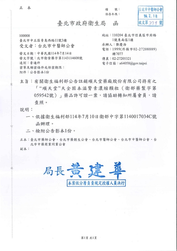 | 台北市中医师公会 官网:http://www.tpcma.org.tw 地址:台北市中正区青岛西路11号3楼 E-mail:tp.cma@msa.hinet.net 电话:(02)2314-3456(代表号) 传真:(02)2314-8181 |