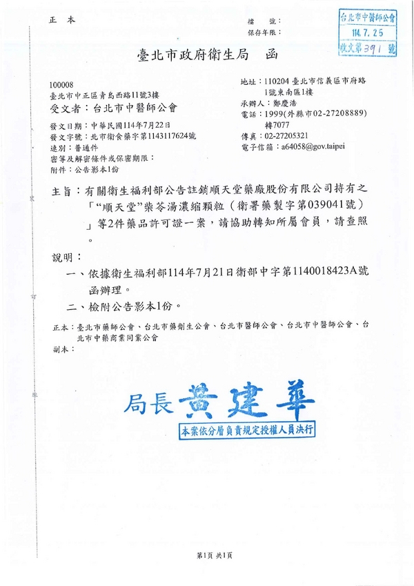 | 台北市中医师公会 官网:http://www.tpcma.org.tw 地址:台北市中正区青岛西路11号3楼 E-mail:tp.cma@msa.hinet.net 电话:(02)2314-3456(代表号) 传真:(02)2314-8181 |