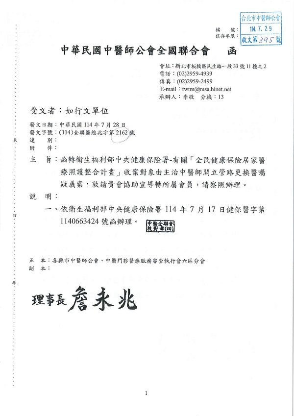 | 台北市中医师公会 官网:http://www.tpcma.org.tw 地址:台北市中正区青岛西路11号3楼 E-mail:tp.cma@msa.hinet.net 电话:(02)2314-3456(代表号) 传真:(02)2314-8181 |