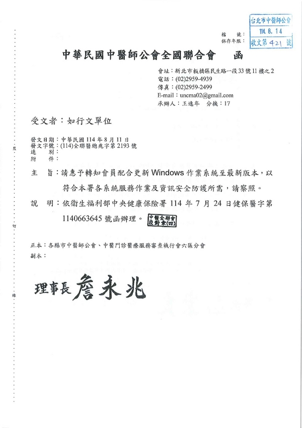 | 台北市中医师公会 官网:http://www.tpcma.org.tw 地址:台北市中正区青岛西路11号3楼 E-mail:tp.cma@msa.hinet.net 电话:(02)2314-3456(代表号) 传真:(02)2314-8181 |