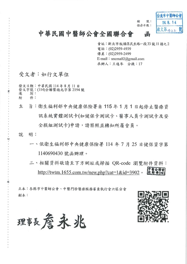 | 台北市中医师公会 官网:http://www.tpcma.org.tw 地址:台北市中正区青岛西路11号3楼 E-mail:tp.cma@msa.hinet.net 电话:(02)2314-3456(代表号) 传真:(02)2314-8181 |