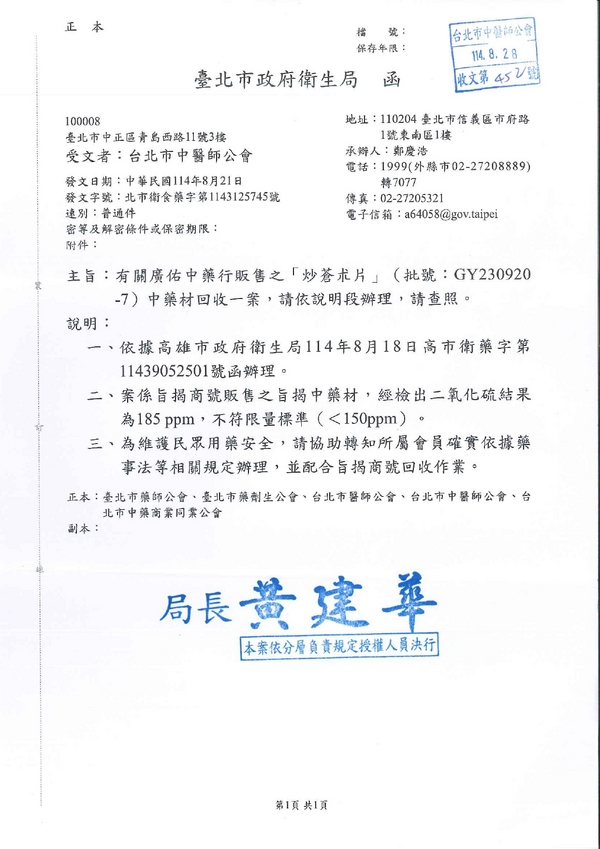 | 台北市中医师公会 官网:http://www.tpcma.org.tw 地址:台北市中正区青岛西路11号3楼 E-mail:tp.cma@msa.hinet.net 电话:(02)2314-3456(代表号) 传真:(02)2314-8181 |