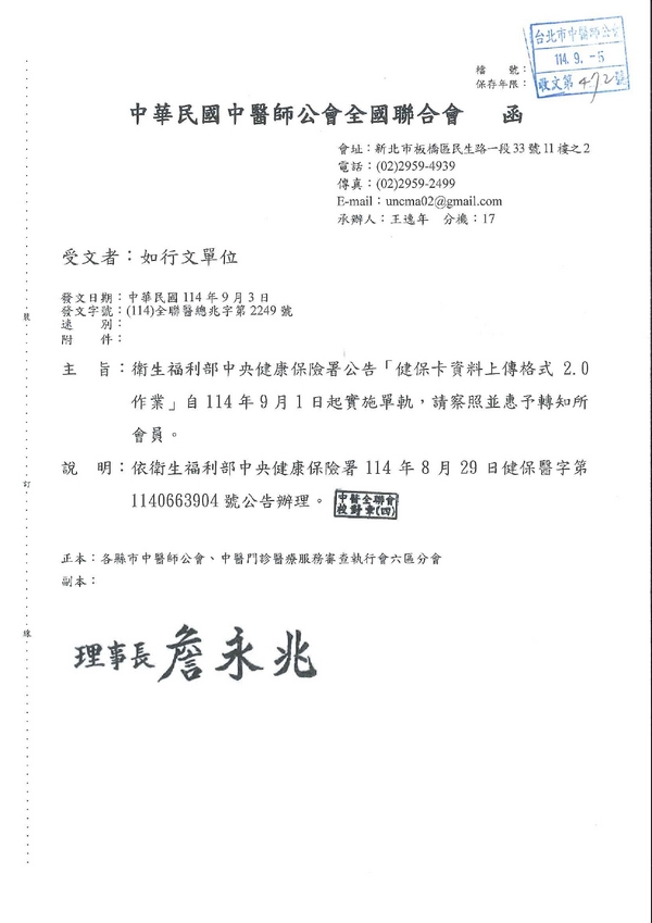 | 台北市中医师公会 官网:http://www.tpcma.org.tw 地址:台北市中正区青岛西路11号3楼 E-mail:tp.cma@msa.hinet.net 电话:(02)2314-3456(代表号) 传真:(02)2314-8181 |