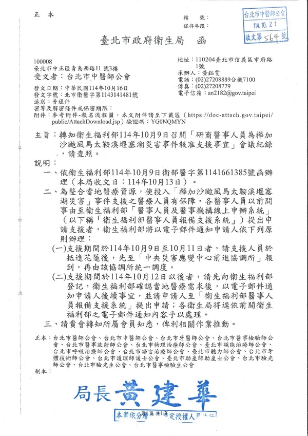 | 台北市中医师公会 官网:http://www.tpcma.org.tw 地址:台北市中正区青岛西路11号3楼 E-mail:tp.cma@msa.hinet.net 电话:(02)2314-3456(代表号) 传真:(02)2314-8181 |