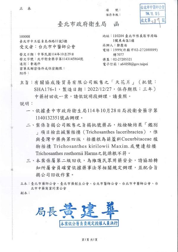 | 台北市中医师公会 官网:http://www.tpcma.org.tw 地址:台北市中正区青岛西路11号3楼 E-mail:tp.cma@msa.hinet.net 电话:(02)2314-3456(代表号) 传真:(02)2314-8181 |