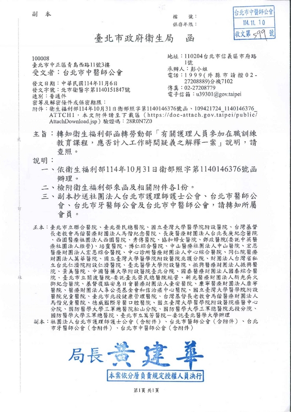 | 台北市中医师公会 官网:http://www.tpcma.org.tw 地址:台北市中正区青岛西路11号3楼 E-mail:tp.cma@msa.hinet.net 电话:(02)2314-3456(代表号) 传真:(02)2314-8181 |