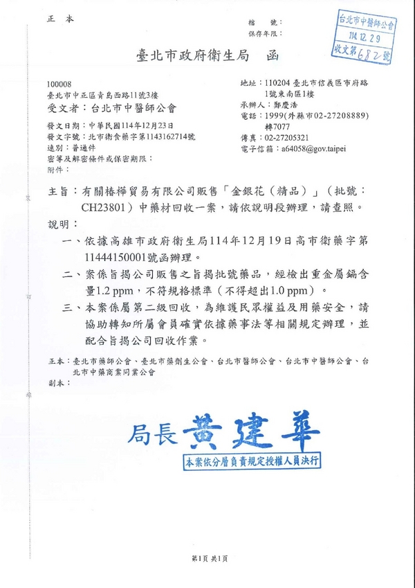 | 台北市中医师公会 官网:http://www.tpcma.org.tw 地址:台北市中正区青岛西路11号3楼 E-mail:tp.cma@msa.hinet.net 电话:(02)2314-3456(代表号) 传真:(02)2314-8181 |