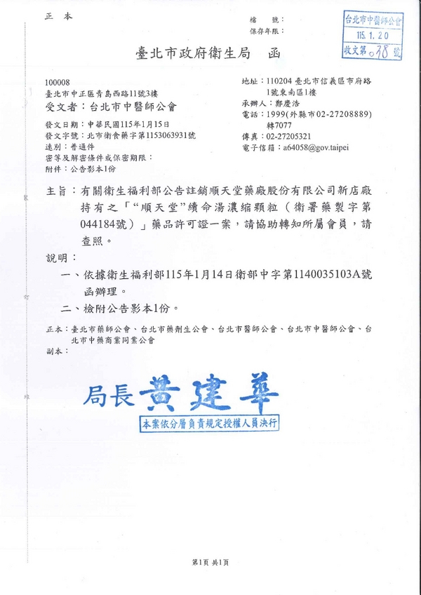 | 台北市中医师公会 官网:http://www.tpcma.org.tw 地址:台北市中正区青岛西路11号3楼 E-mail:tp.cma@msa.hinet.net 电话:(02)2314-3456(代表号) 传真:(02)2314-8181 |
