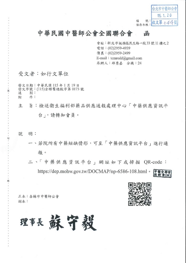 | 台北市中医师公会 官网:http://www.tpcma.org.tw 地址:台北市中正区青岛西路11号3楼 E-mail:tp.cma@msa.hinet.net 电话:(02)2314-3456(代表号) 传真:(02)2314-8181 |