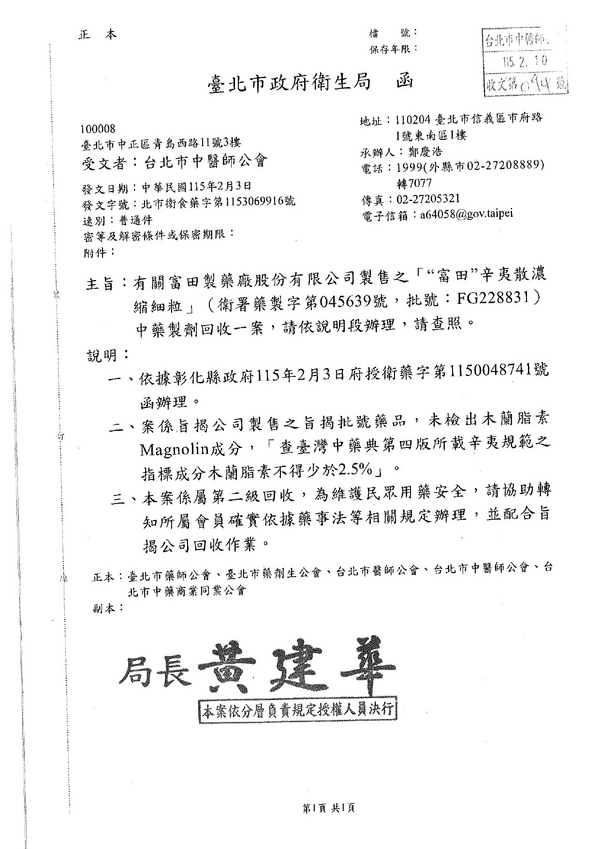 | 台北市中医师公会 官网:http://www.tpcma.org.tw 地址:台北市中正区青岛西路11号3楼 E-mail:tp.cma@msa.hinet.net 电话:(02)2314-3456(代表号) 传真:(02)2314-8181 |