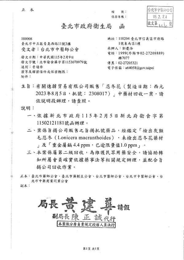 | 台北市中医师公会 官网:http://www.tpcma.org.tw 地址:台北市中正区青岛西路11号3楼 E-mail:tp.cma@msa.hinet.net 电话:(02)2314-3456(代表号) 传真:(02)2314-8181 |
