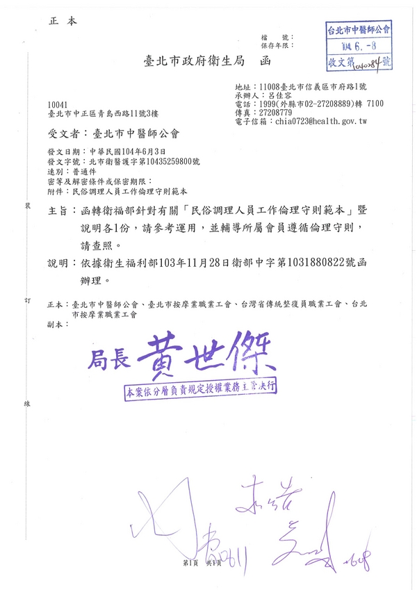 | 台北市中医师公会 官网:http://www.tpcma.org.tw 地址:台北市中正区青岛西路11号3楼 E-mail:tp.cma@msa.hinet.net 电话:(02)2314-3456(代表号) 传真:(02)2314-8181 |